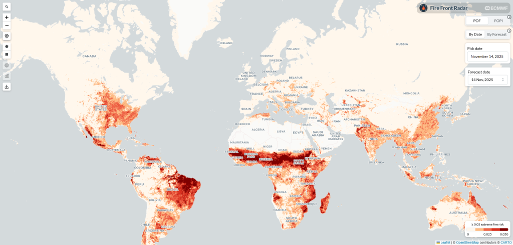 To build the platform, we worked with two innovative indices produced by ECMWF. The first, the Fire Occurrence Probability Index (FOPI), offers a major improvement over traditional forecasting. Older models often relied on weather alone. FOPI goes further by incorporating satellite observations that track vegetation health and moisture. This matters because dryness alone doesn’t tell the whole story. A desert may be dry, but without vegetation, there’s nothing to burn. FOPI filters out these false alarms and highlights regions where both dryness and vegetation come together to create a genuine fire danger. It gives users a more realistic picture of where ignition is actually possible.
